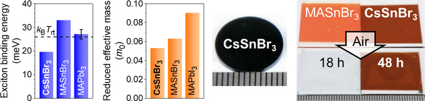 基于此,课题组选择了无机含锡钙钛矿材料作为研究对象。作者制备了高质量的CsSnBr3薄膜和晶体样品,用多种手段测量和计算了CsSnBr3的带隙能、激子结合能、介电常数和载流子有效质量等关键性能参数,尤其在带隙能和激子结合能两方面达到了实验和理论相吻合,证明CsSnBr3的激子结合能低于室温对应的热能。此结果说明CsSnBr3受光照产生的电子与空穴是自由运动的,有利于被收集并转化为电能。另一方面,作者利用有机钙钛矿材料作为参照物,表明CsSnBr3的半导体性能主要由其溴化锡框架决定,而无机铯离子显著地提升了材料的稳定性。
