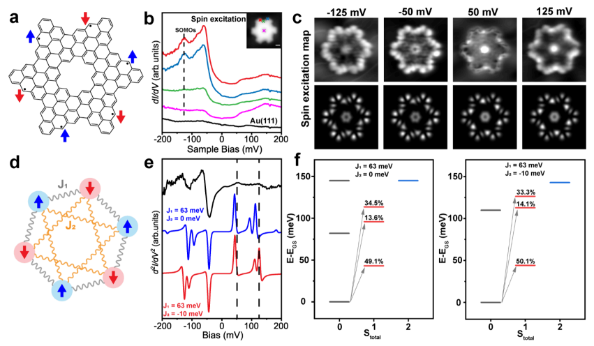 MFH计算表明,冠状分子的前沿轨道被相反自旋的电子填充,基态为反铁磁单重态。非弹性电子隧穿谱(IETS)显示在费米能级附近有一个U形能隙特征(图3)。由于集体自旋激发,分子存在两对激发台阶,分别在±125mV和±50mV。在激发能下的自旋激发图与计算得到SOMO和SUMO的电子态一致,可知这一冠状分子的确具有单重态基态。为进一步理解分子的集体自旋激发,研究团队用海森堡模型计算了该系统的基态和激发态(图3d)。通过对比只考虑最近邻相互作用和加入次近邻相互作用的理论模拟,结果表明,次近邻相互作用在自旋冠状分子中起到关键作用。自旋冠状分子还可以作为调控量子磁性的纳米平台,通过额外的氢原子吸附并结合STM针尖操控,能够实现高自旋与反铁磁耦合的自旋调控。