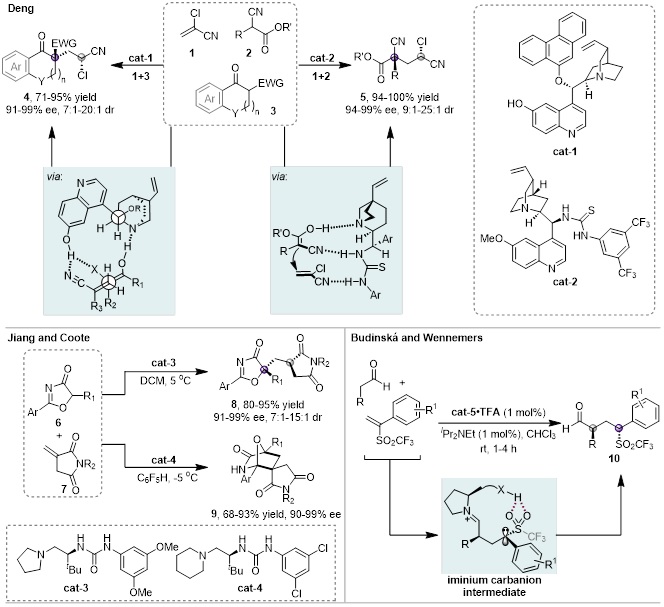 双功能催化策略利用双官能团催化剂,其中不同官能团可活化底物中的不同基团,该催化剂与底物间的相互作用能精准调控反应的立体选择性,从而高效构建非连续的手性中心。