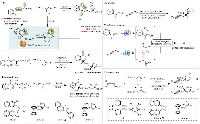 协同催化策略通过使用两种或多种不同的催化剂,分别激活不同的反应物,并独立控制各手性单元的构型。通过巧妙地组合不同的手性催化剂,能够实现对所有可能立体异构体的发散性合成。