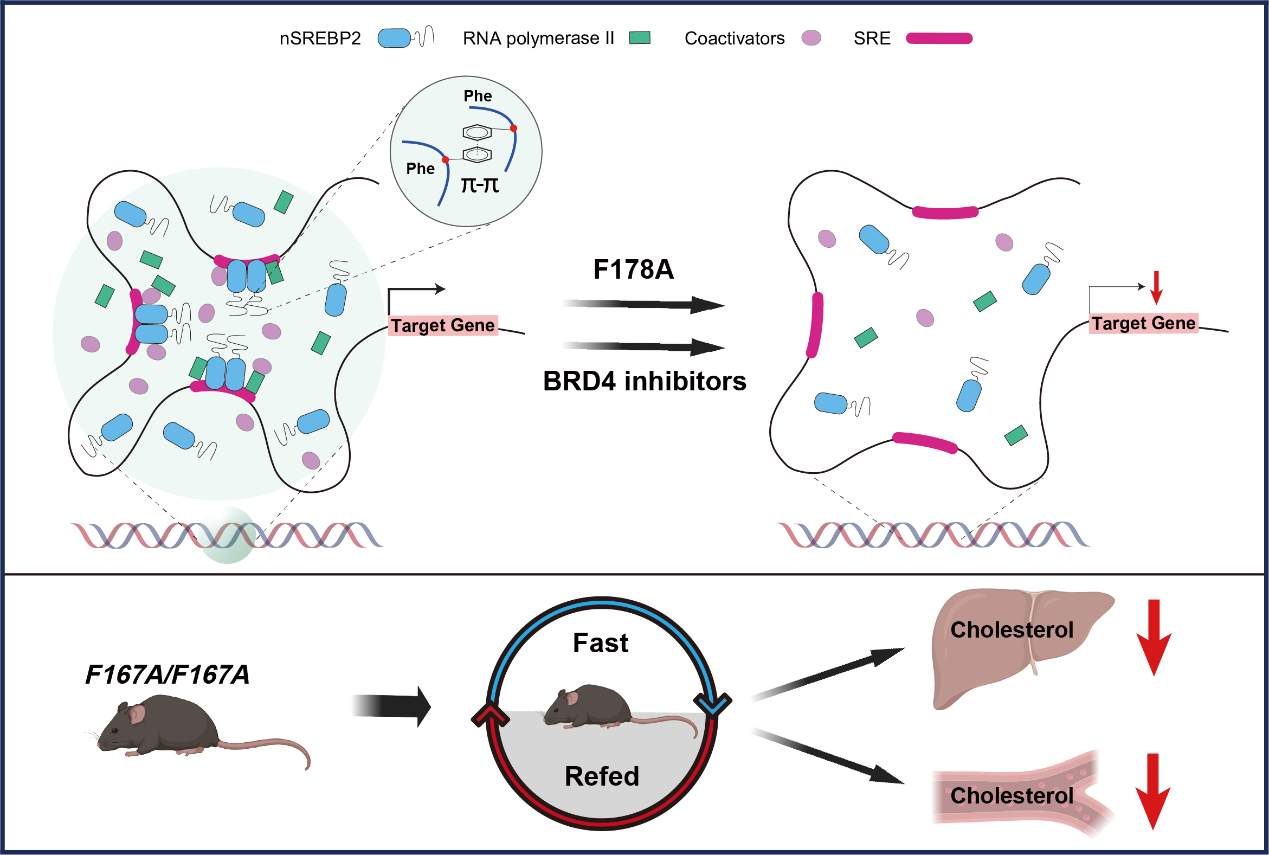 本研究发现了nSREBP2 通过苯丙氨酸F发生相分离形成凝聚体,与转录相关蛋白相互作用形成超级增强子,促进胆固醇合成相关基因的转录激活,进而调控体内胆固醇和脂质的稳态。该发现不仅为nSREBP2调节胆固醇稳态提供了新的生物学机制,而且为在特定代谢或疾病条件下调节nSREBP2的功能提供了新的切入点。