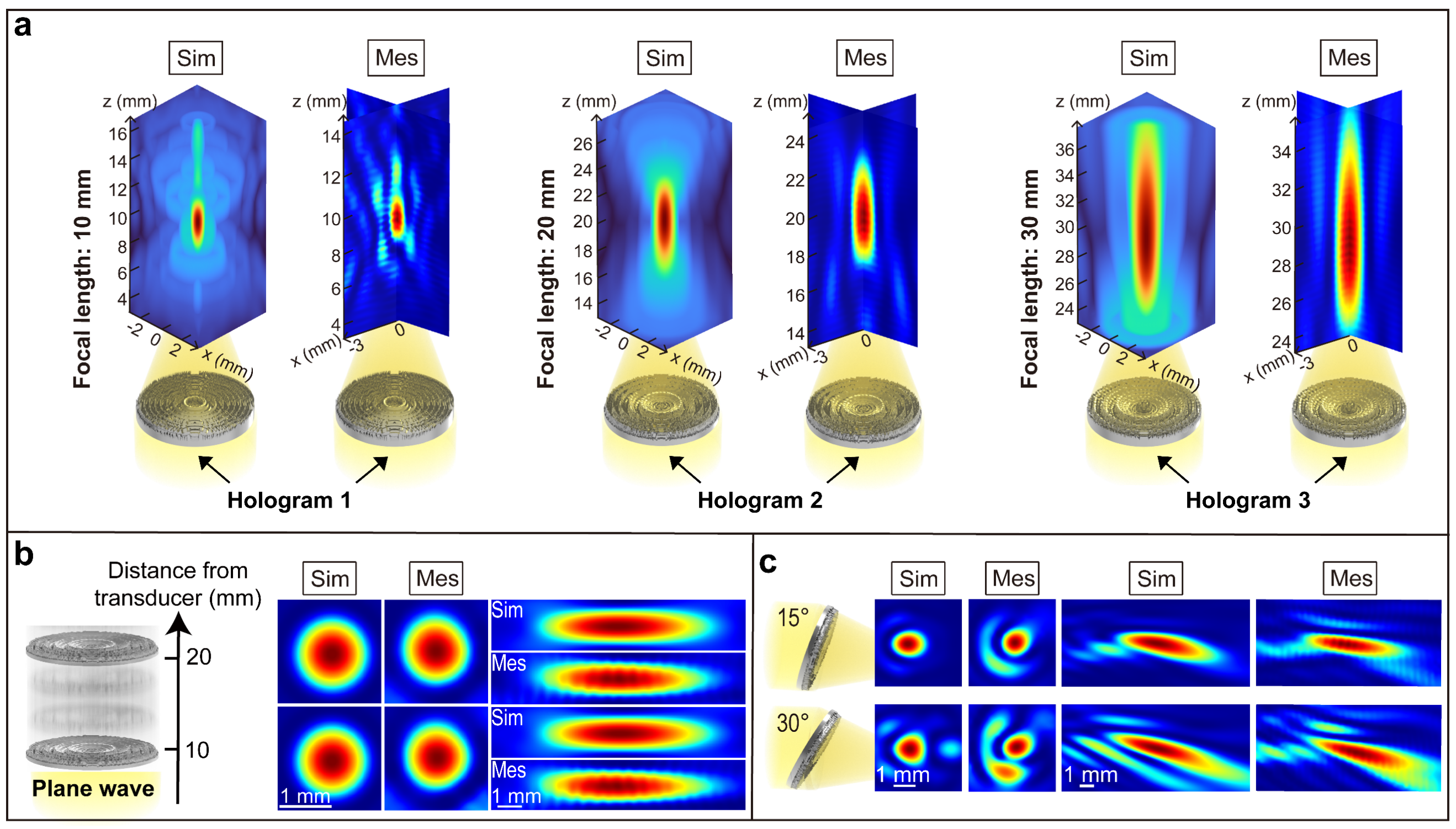该研究采用迭代角谱法设计声学全息超表面,并通过低成本的3D打印制作,结合单阵元平面波超声换能器,成功实现多个不同深度的超声精准聚焦(见图2a)。研究还系统分析了声全息超表面的聚焦性能与波束转向能力,展示了该技术在轴向与横向上的精确波束操控潜力(见图2b,c)。