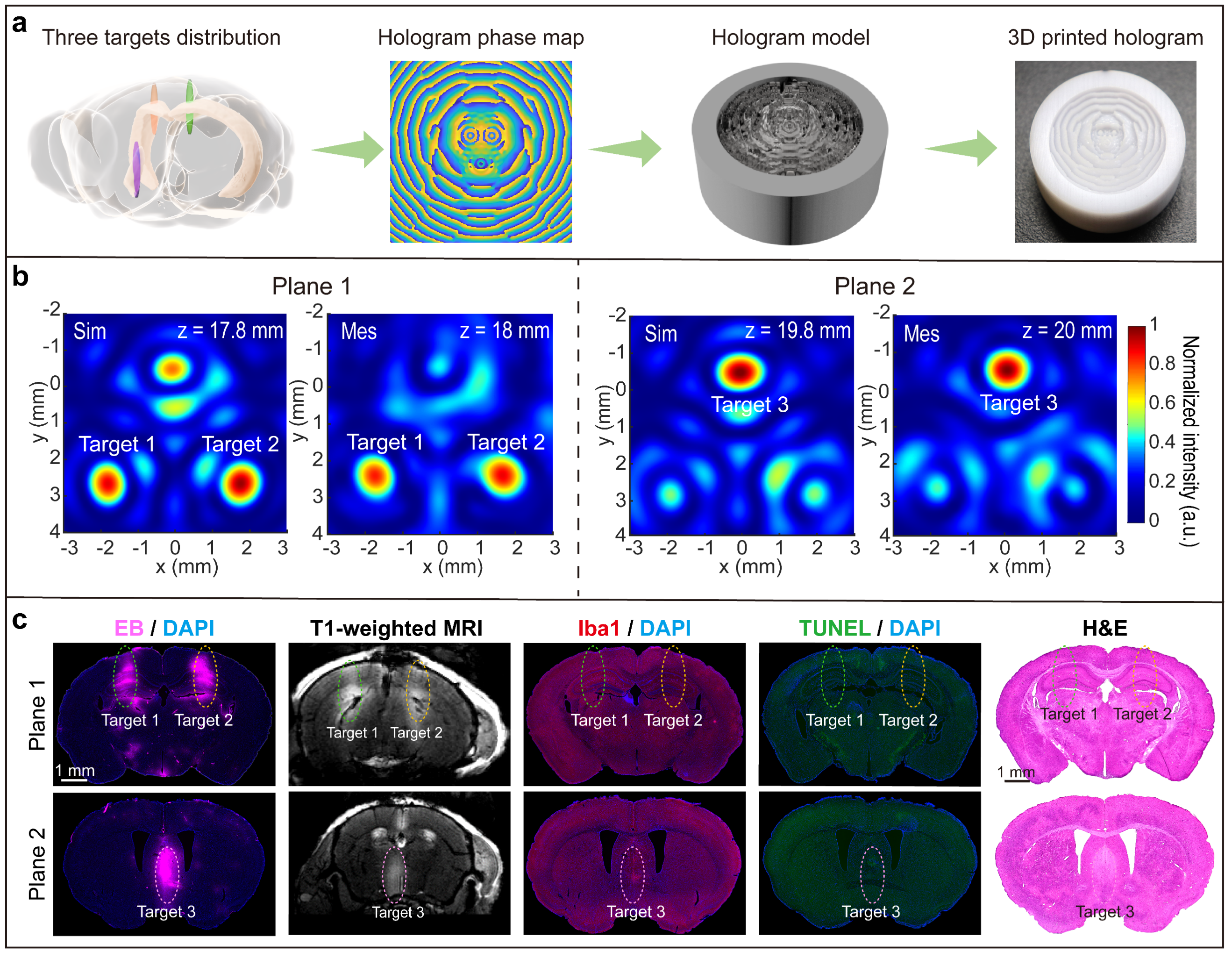 图3:基于声学全息超表面的小鼠脑内多靶点血脑屏障同步开放。a. 迭代角谱法设计多焦点声全息超表面流程图。b. 双平面三焦点全息超表面声场仿真与测试结果。c. 荧光成像、MRI、免疫组化及组织学分析结果。