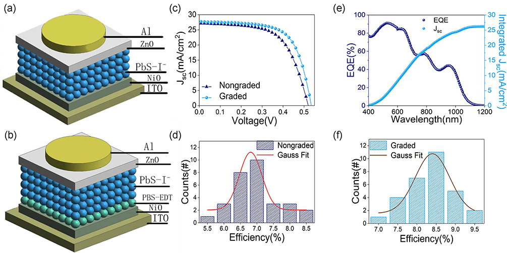 Figure. a) Schematic of non-graded and b) graded inverted QD solar cell. Characterizations for inverted QD solar cells. c) J–V curves under standard AM 1.5 light illumination (100 mW cm2) of the non-graded and graded devices. Both Jsc for two devices are higher than 27 Am cm2. e) EQE spectrum for graded structure device. d, f) Histogram of PEC with statistics based on 30 devices for the same batch. Average efficiencies are 7% and 8.5% for non-graded structure and graded structure, respectively.