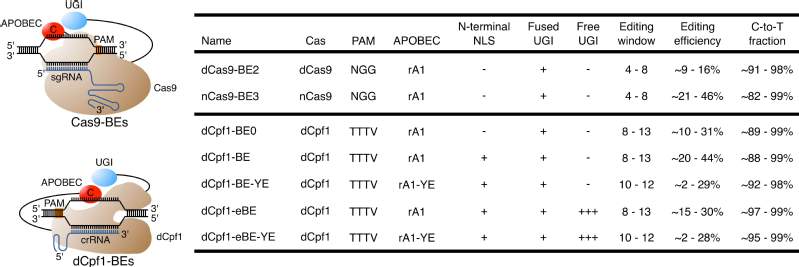 Summary of Cas9-based and dCpf1-based BEs