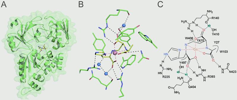 (A) The surface structure of the CntA/StP/Co2+ complex. (B/C) Detailed interactions between CntA and StP/Co2+.