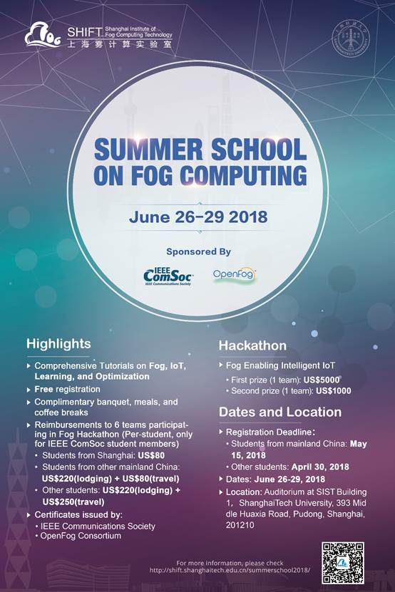 2018 Summer School on “Fog Computing” will be held in Shanghai, on ShanghaiTech University campus, from June 26 to 29, 2018. The goal of this summer school is to bring together the world-class researchers in Fog Computing with undergraduate, graduate students and interested researchers from academia and engineers from industry, to educate the audience on both basics and recent advancements in Fog Computing overview, IoT, Optimization, Big Data, and Deep Learning, and to encourage collaborations on related topics. This summer school would also include a 24 hours’ hackathon after the two-days’ classes on Fog Computing, to encourage the students gather to collaborate and challenge themselves to build a project about Fog Computing from start to finish. It is an invaluable opportunity for the participants to gain coding experience, learn fog computing, and win awesome prizes.