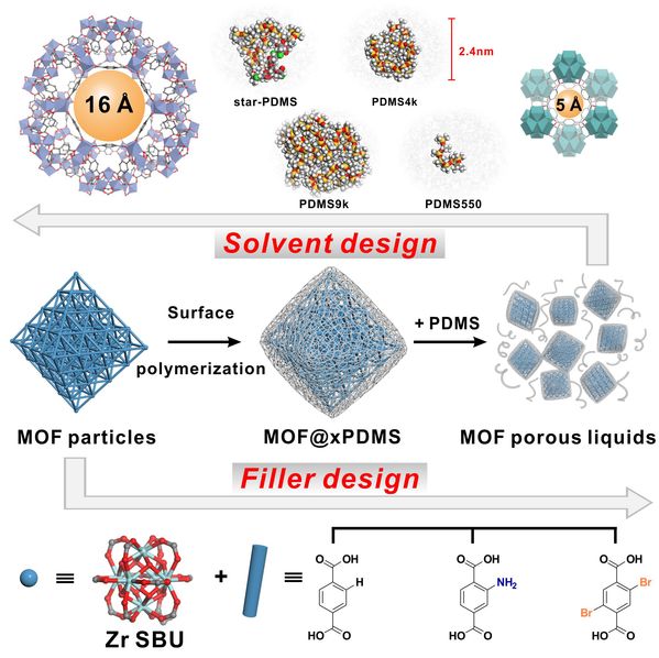 In this work, researchers use surface-functionalized MOF particles as porous fillers and liquid PDMS as bulky solvents. Using a generalizable non-covalent surface-initiated controlled radical polymerization technique, a series of isoreticular UiO-66 particles were dispersed in a liquid PDMS solvent with excellent homogeneity and colloidal stability. Benefiting from the inherent properties of PDMS, the PLs exhibit low vapor pressure, high thermal stability, and fluidity down to -35°C. Attributing to the bulkiness of PDMS and its inherent high permeability, the sorption properties of the MOF fillers can be largely retained in their respective PLs as confirmed by low pressure CO2, Xe and H2O sorption isotherms. The permanent porosity of the PLs can also be largely preserved even after 15 months of storage. Moreover, they demonstrated that by tuning the molecular weight and polymer chain architecture of PDMS, it is possible to preserve the permanent porosity of a mesoporous MOF, MIL-101(Cr) (mesopores as large as 3.4 nm), within a PL.
