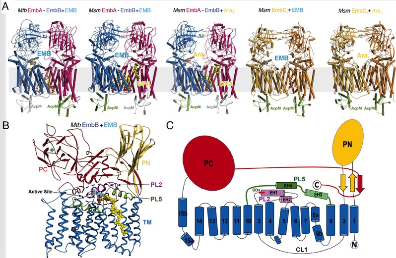 Figure Legend: (A) Structures of Mycobacterium tuberculosis (Mtb) and Mycobacterium smegmatis (Msm) EmbA-EmbB-AcpM2 and EmbC2-AcpM2 in complex with substrates (Ara2, DPA) and drug ethambutol (EMB); (B) Domains and structural features of Emb proteins, represented by Mtb EmbB; (C) Topological diagram of Emb proteins