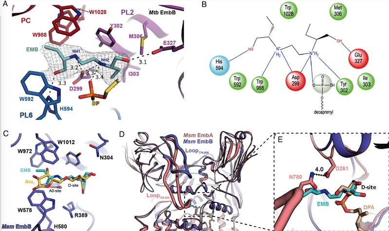 Mtb has a complex cell wall compared to Gram-negative and Gram-positive bacteria. Its core structure, mycolyl-arabinogalactan-peptidoglycan (mAGP), is composed of three highly unusual elements covalently linked together: (i) long-chain mycolic acids (MA), (ii) a highly branched arabinogalactan (AG), and (iii) a cross-linked network of peptidoglycan (PG) and other key components such as lipoarabinomannan (LAM). The mycobacterial cell wall acts as a natural barrier surrounding the cell membrane. Inhibition of Mtb cell wall assembly is an established strategy for anti-TB chemotherapy, and the targeting of cell-wall biosesynthesis is regarded as the mode of action of first-line drugs like ethambutol and isoniazide. The membrane-embedded Emb proteins, EmbA, EmbB and EmbC, which are involved in AG (EmbA/EmbB) and LAM (EmbC) biosesynthesis are regarded as the targets of ethambutol. However, the molecular mechanism of ethambutol inhibition remains unclear, thus hindering the design of new-generation ethambutol-based drugs aimed at conquering drug resistance.
