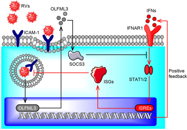 In addition, the researchers identified OLFML3 as a novel host factor of RV and proved that OLFML3 has inducible expression upon RV infection and could antagonize the innate immune response of host cells. By in-depth study of the mechanism of OLFML3 action, they found that OLFML3 inhibits type I IFN signaling and promotes RV infection by a SOCS3-dependent inhibition of IFNs and IFN-stimulated genes (ISGs). Notably, the biological functions of OLFML3 are poorly understood and this study is the first report describing the immunosuppressive function of OLFML3 during pathogen immunity.