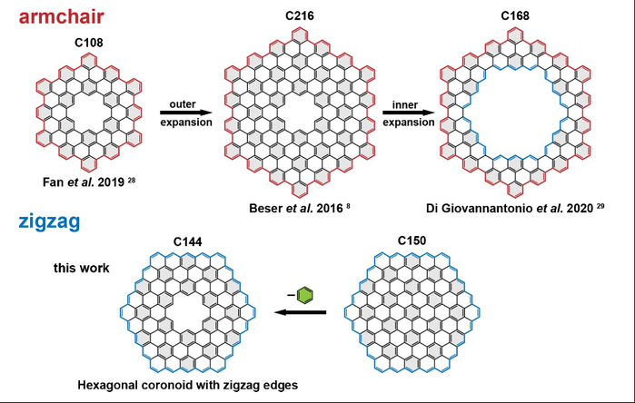 To overcome the challenge of synthesizing coronoid in solution as well as the characterization difficulty due to its low solubility, scientists have obtained hexagonal coronoids with specifically designed precursors, which can undergo hierarchical Ullmann coupling and cyclodehydrogenation through on-surface synthesis. However, all the reported coronoids host armchair outer edges rather than zigzag edges, due to the aryl−aryl coupling dominantly occurring along the armchair direction. So far, the hexagonal coronoids with zigzag edges along the external periphery have not been reported, either in solution or on the surface.