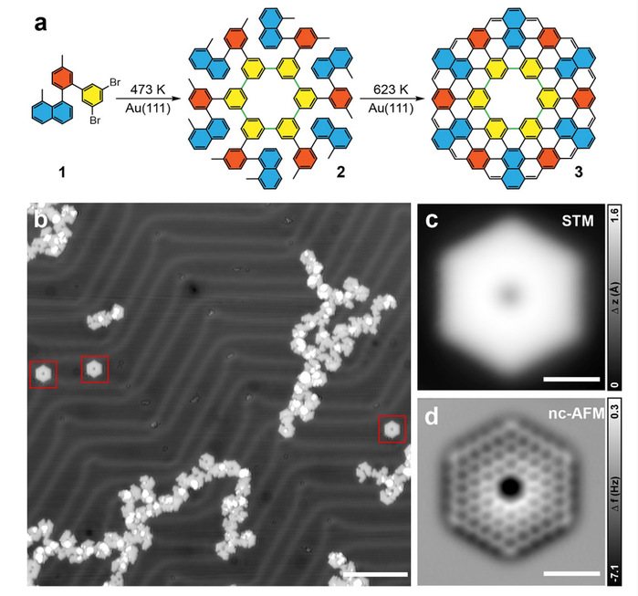 In the research, the team designed a precursor 1, consisting of three chemical components (methylnaphthalene, methylbenzene, and 3,5-dibromobenzene), in which the two bromo groups are designed for the macrocylization on surface and the two methyl substituents are expected to undergo cyclodehydrogenation and ring closure reactions to form the zigzag outer edges. The molecular structure of zigzag C144 coronoid is unambiguously evidenced by non-contact atomic force microscopy (nc-AFM) measurements. Its corresponding electronic structures have been further investigated with scanning tunneling microscopy/spectroscopy (STM/STS) measurements, supported by density functional theory (DFT) calculations.