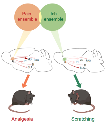 The research team further elucidated the bidirectional regulation of neuronal ensembles specifically labeled as acute pain or acute itch, associated with the pain and itching behaviors of mice by utilizing targeted labeling and manipulation of active neuronal populations. They found that two distinct neuronal populations exists in the PL division that can independently encode pain and itch and regulate pain- and itch-related behavioral outputs in opposite ways.