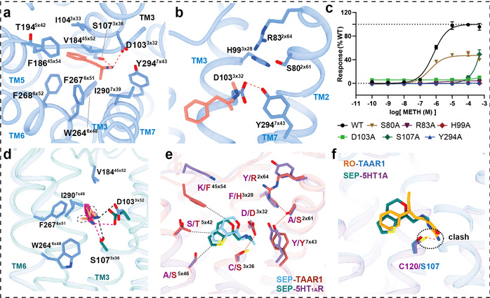 In this study, researchers employed the cryo-electron microscopy technology to determine, for the first time, the high-resolution structures of the human TAAR1-Gs protein complex with METH, endogenous ligand β-PEA, selective agonist RO5256390 and clinical-stage candidate drug SEP-363856 (Figure 1). Structural analysis revealed that METH is positioned in the orthosteric binding pocket of TAAR1, specifically interacting with TAAR1 through polar interactions with aspartic acid at position 103 and tyrosine at position 294 (Figure 2a-b). Furthermore, a hydrogen bond network formed by the ligand-binding pocket and surrounding amino acids contributes to stabilizing the interaction between the ligand and TAAR1 (Figure 2b-c). The second extracellular loop of TAAR1 forms a unique “lid” structure, involving the highly specific phenylalanine at position 186 and other hydrophobic amino acids, directly or indirectly participating in ligand interaction, thus establishing TAAR1’s distinctive molecular recognition mechanism (Figure 2a). Compared to the endogenous ligand β-PEA, METH exhibits weaker polar interactions with the key residues aspartic acid at position 103 and serine at position 107, resulting in decreased affinity to TAAR1. This may serve as the structural basis for β-PEA’s more efficient binding to TAAR1 than METH (Figure 2d). Molecular dynamics simulations and systematic mutation and functional experiments validated these conclusions.