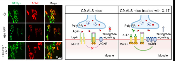 This study discovered that the new mechanism causing structural and functional abnormalities of the neuromuscular junction in the C9orf72-ALS mouse model is due to motor neurons secreting poly-PR proteins, which inhibit the sustained activation of MuSK signaling essential for maintaining the neuromuscular junction. Interestingly, injecting a MuSK agonist monoclonal antibody into the ALS mouse model improved the structure and function of the neuromuscular junction, enhanced the motor abilities of the mice, and extended their lifespan. This demonstrated the potential of MuSK antibodies as a new therapeutic strategy for ALS. Since neuromuscular junction defects, particularly muscle denervation, are an early manifestation in all ALS patients, this therapeutic strategy could have potential applications for a wide range of ALS patients.