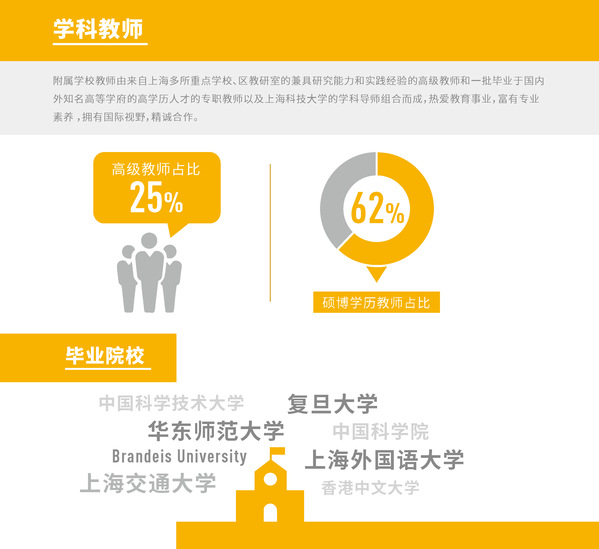 学校拥有一支理念前瞻、经验丰富、富有爱心的师资队伍,即由顶尖教育名师组成的专家团队;由上科大教授、博导组成的导师团队;由一批市区知名的资深教师和富有创新精神的高学历中青年教师组成的执教团队。